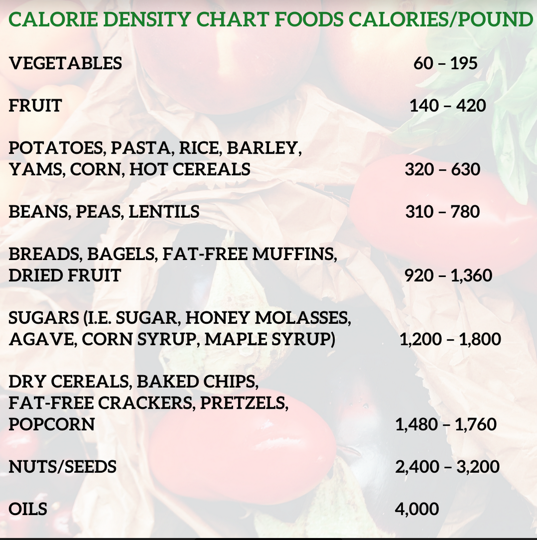 “Calorie density is the number of calories per a given weight of food. Most of the time, calorie density is calculated as calories per 100 grams of food. While memorizing the exact calorie density of foods is unnecessary, being familiar with which types of foods are comparatively high and low in calories is important. Calorie density is related to the amount of water and fiber in a food—the more water and fiber, the fewer calories per volume of food. Note: Foods high in water and fiber content are also generally high in nutrient density (i.e., are good sources of vitamins, minerals, and phytonutrients) as well.”